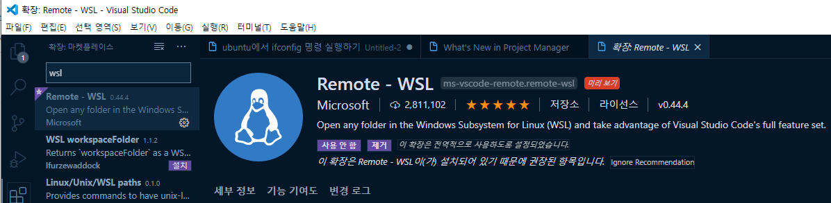 1. VSCODE 에 WSL 관련 플러그인 설치