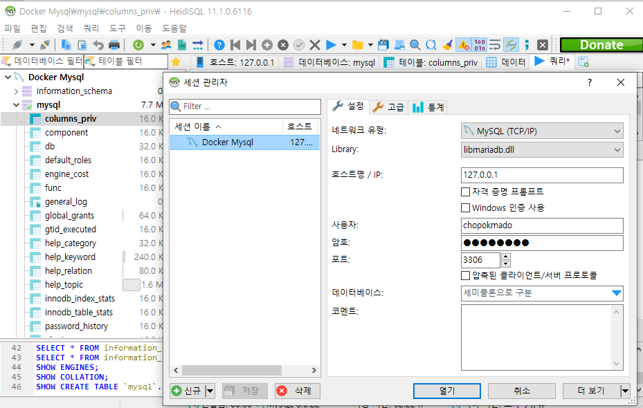 -p 3306:3306 : 앞 3306 은 현재 로컬 PC의 포트를 의미하고 뒤의 3306은 수행한 컨테이너 내부의 3306 포트를 의미한다. 포트포워딩을 설정한다.